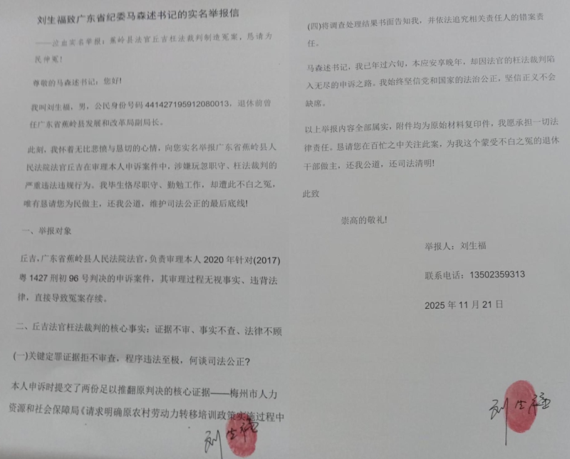 刘生福致广东省纪委马森述书记的实名举报信 泣血实名举报:蕉岭县法官丘吉枉法裁判制造冤...