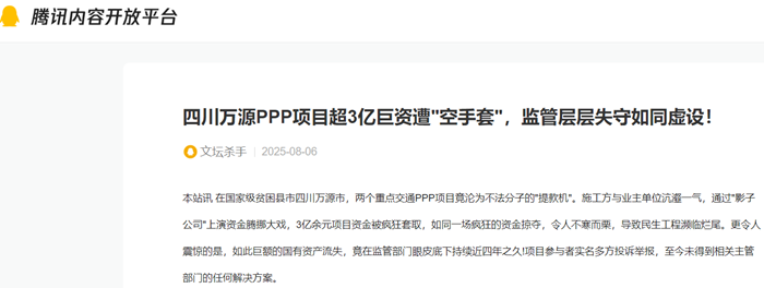 本站讯 在国家级贫困县市四川万源市,两个重点交通PPP项目竟沦为不法分子的"提款机"。施工方与业主单位沆瀣一气,通过"影子公司"上演资金腾挪大戏,3亿余元项目资金被疯狂套取,如同一场疯狂的资金掠夺,令人不寒而栗,导致民生工程濒临烂尾。更令人震惊的是,如此巨额的国有资产流失,竟在监管部门眼皮底下持续近四年之久!项目参与者实名多方投诉举报,至今未得到相关主管部门的任何解决方案。