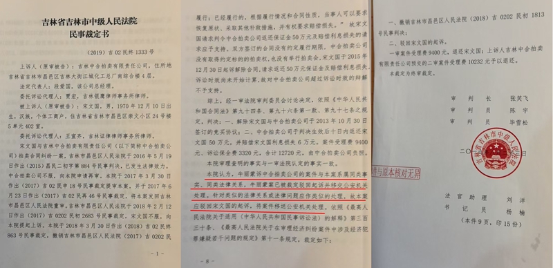 更令人感到不可思议的是,早在2019年,吉林市中级法院作出的(2019)吉民终1333号民事裁定书,依据同案同判的原则,驳回了宋文国的起诉,将此案移送公安机关,至今这一裁定仍然是生效裁定,而同一个法院却就痛一个案件作出了截然不同的判决,实在是令人匪夷所思。