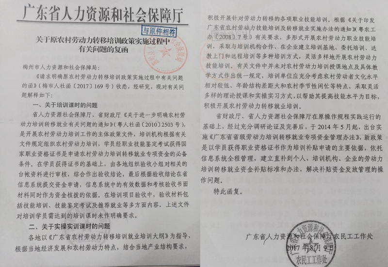 3.广东省人社厅《关于原农村劳动力转移培训政策实施过程中有关问题的复函》(复印件);