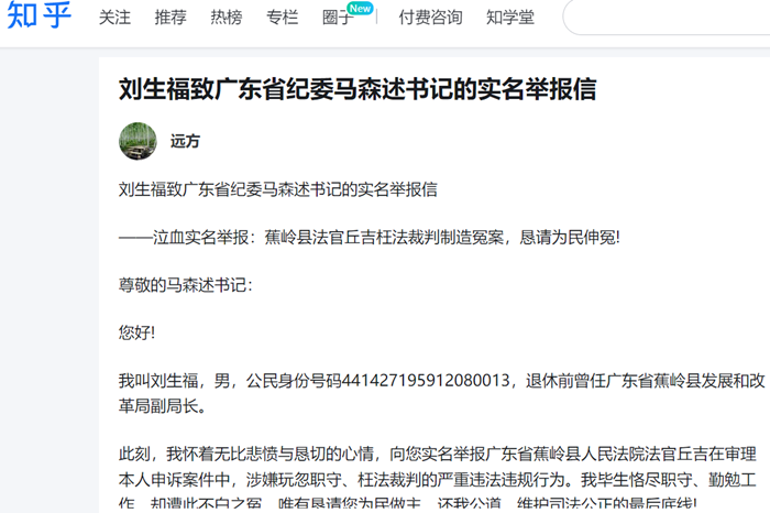 刘生福致广东省纪委马森述书记的实名举报信 泣血实名举报:蕉岭县法官丘吉枉法裁判制造冤...