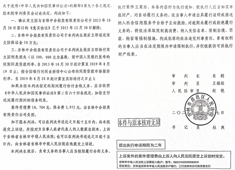 案件的审理进程充满曲折:2021年,因关键嫌疑人郭丽华死亡,公安机关撤销相关刑事案件;2023年,吉林省高院指令吉林市昌邑区法院启动再审;2025年,吉林市中院作出二审判决,维持一审结果,判令中合拍卖返还宋文国50万元保证金及利息。