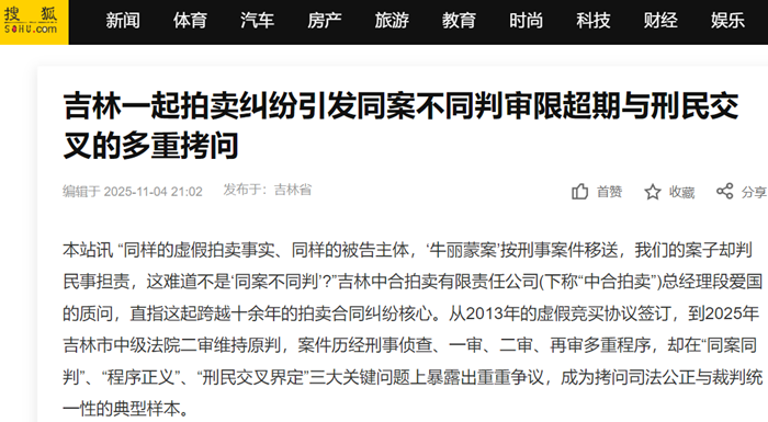 本站讯 “同样的虚假拍卖事实、同样的被告主体,‘牛丽蒙案’按刑事案件移送,我们的案子却判民事担责,这难道不是‘同案不同判’?”吉林中合拍卖有限责任公司(下称“中合拍卖”)总经理段爱国的质问,直指这起跨越十余年的拍卖合同纠纷核心。从2013年的虚假竞买协议签订,到2025年吉林市中级法院二审维持原判,案件历经刑事侦查、一审、二审、再审多重程序,却在“同案同判”、“程序正义”、“刑民交叉界定”三大关键问题上暴露出重重争议,成为拷问司法公正与裁判统一性的典型样本。