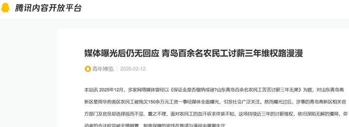 本站讯 2025年12月,多家网络媒体曾经以《保证金是否缴纳成谜?山东青岛百余名农民工苦苦讨薪...