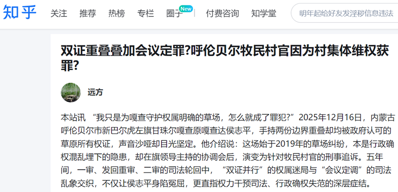 本站讯 “我只是为嘎查守护权属明确的草场,怎么就成了罪犯?”2025年12月16日,内蒙古呼伦贝尔市新巴尔虎左旗甘珠尔嘎查原嘎查达侯志平,手持两份边界重叠却均被政府认可的草原所有权证,声音沙哑却目光坚定。他介绍说:这场始于2019年的草场纠纷,本是行政确权混乱埋下的隐患,却在旗领导主持的协调会后,演变为针对牧民村官的刑事追诉。五年间,一审、发回重审、二审的司法轮回中,“双证并行”的权属迷局与“会议定调”的司法乱象交织,不仅让侯志平身陷冤屈,更直指权力干预司法、行政确权失范的深层症结。