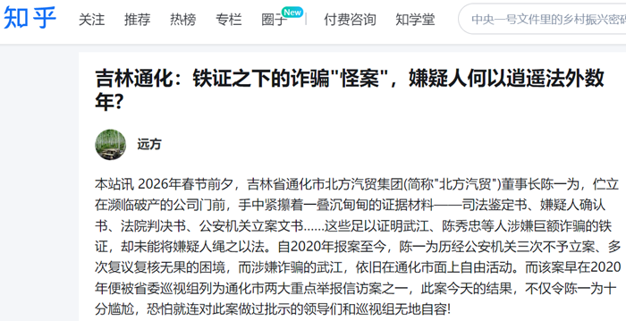 本站讯 2026年春节前夕,吉林省通化市北方汽贸集团(简称"北方汽贸")董事长陈一为,伫立在濒临破产的公司门前,手中紧攥着一叠沉甸甸的证据材料——司法鉴定书、嫌疑人确认书、法院判决书、公安机关立案文书……这些足以证明武江、陈秀忠等人涉嫌巨额诈骗的铁证,却未能将嫌疑人绳之以法。自2020年报案至今,陈一为历经公安机关三次不予立案、多次复议复核无果的困境,而涉嫌诈骗的武江,依旧在通化市面上自由活动。而该案早在2020年便被省委巡视组列为通化市两大重点举报信访案之一,此案今天的结果,不仅令陈一为十分尴尬,恐怕就连对此案做过批示的领导们和巡视组无地自容!