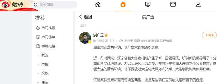 近一段时间来,辽宁省和大连市相继产生了新一届领导班,听说新的领导班子十分重视营商环境建设,对此我必须大力点赞,并向辽宁省和大连市新任领导建言:整顿大连的营商环境,请不要放过大连特大假劣农资案、大连樱桃树集体死亡案。